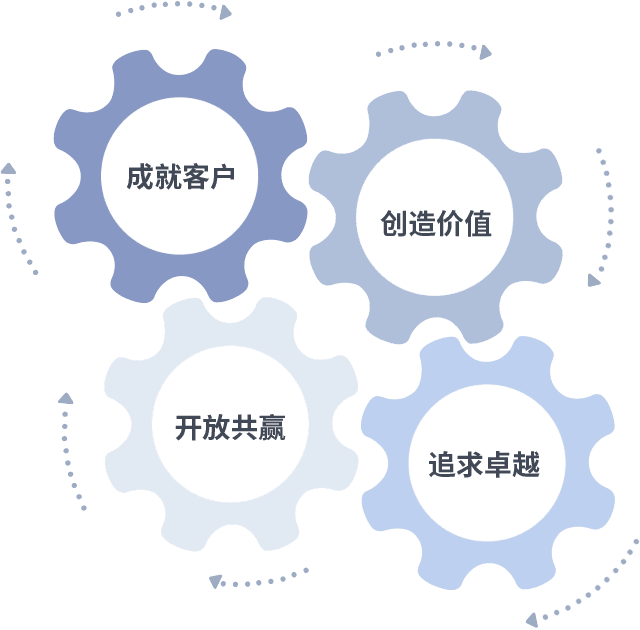 成就客户是一切决策的出发点,,,,创造价值是衡量所有工作的标准,,追求卓越是我们做事做人的态度,,,开放共赢是我们的格局也是最终的结果。。。价值观的齿轮环环相扣,,,推动着组织里的每个人不断向前。。。。